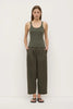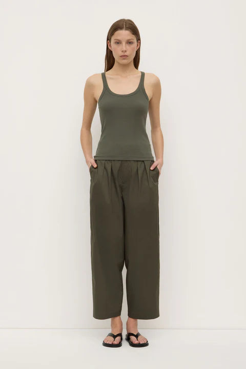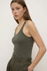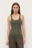 The Charlie Rib Tank in moss is a soft cotton jersey top with a scoop neckline and ribbed stretch finish.