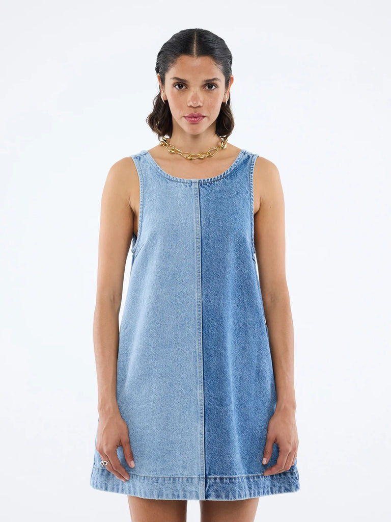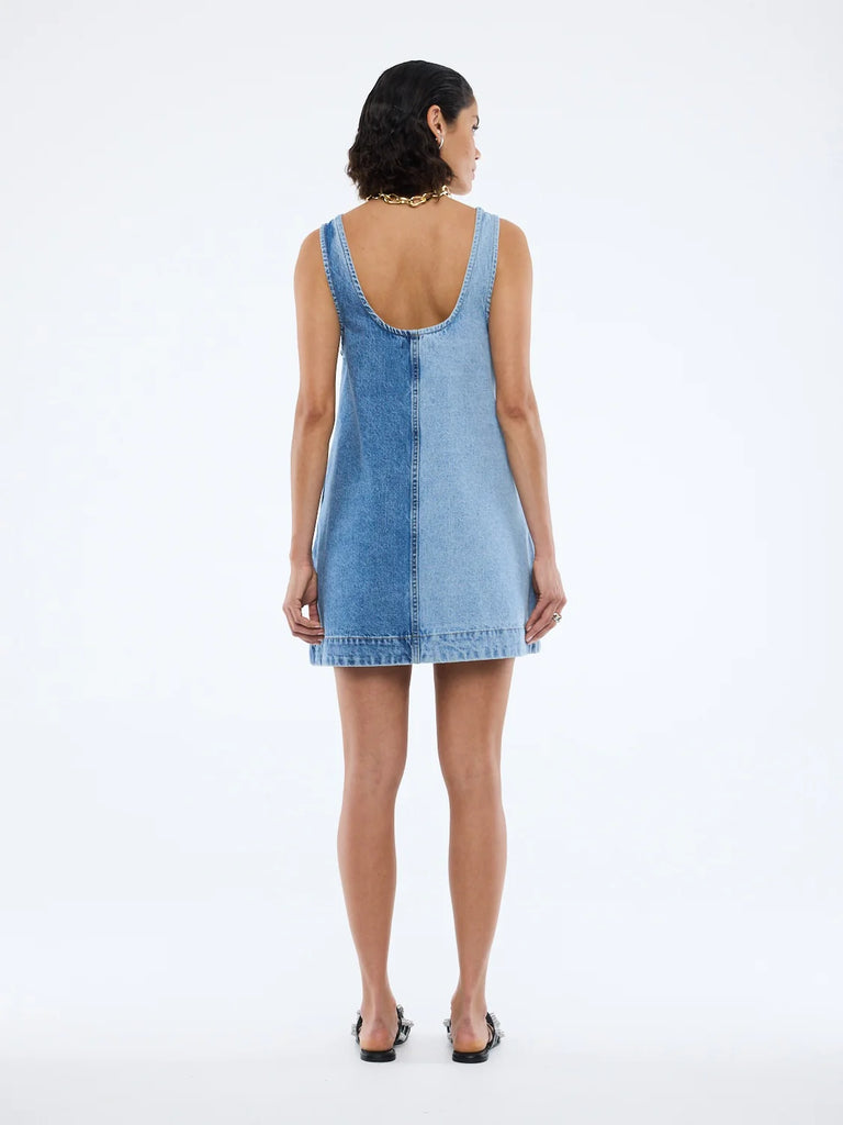 The Lia Spliced Denim Dress features a slight trapeze shape for a flattering effect. With contrast denim and pockets at the side seam, this is the perfect spring wardrobe addition.