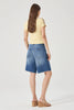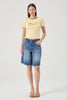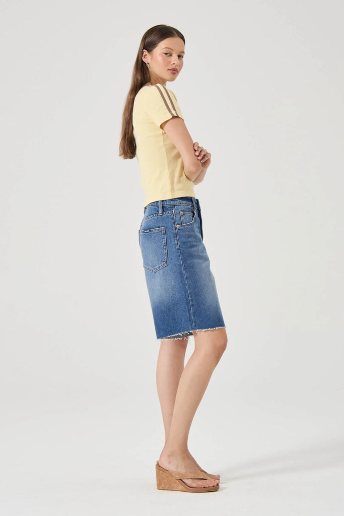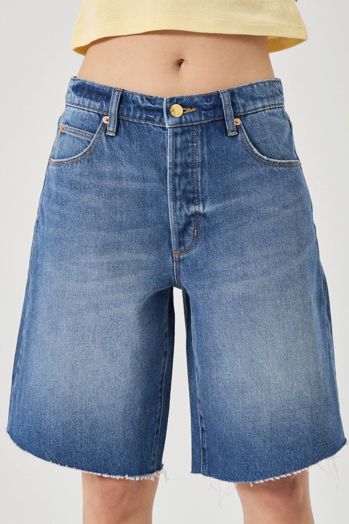 Rollas- It is a relaxed, high rise fit short with a shaped hem that finishes at the knee