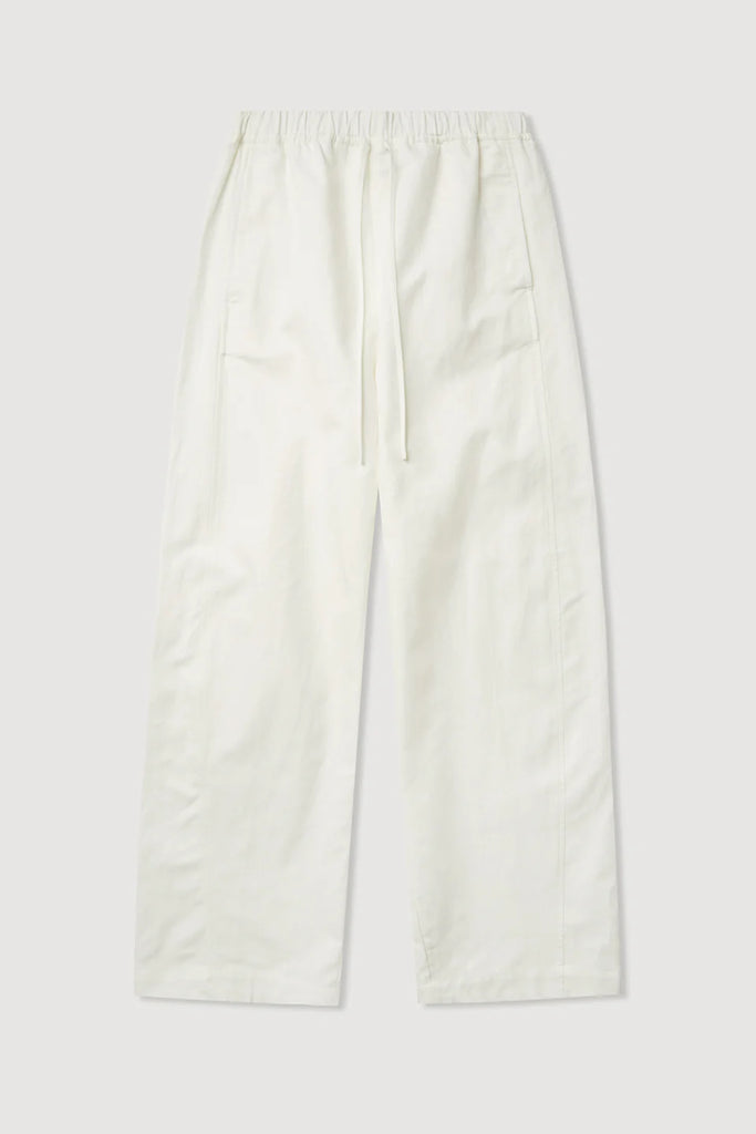 AssemblyLightweight textured cotton-linen blend pant featuring a tapered barrel-style leg. The elasticated waist band and draw cord allows you to adjust the pant to your desired fit.