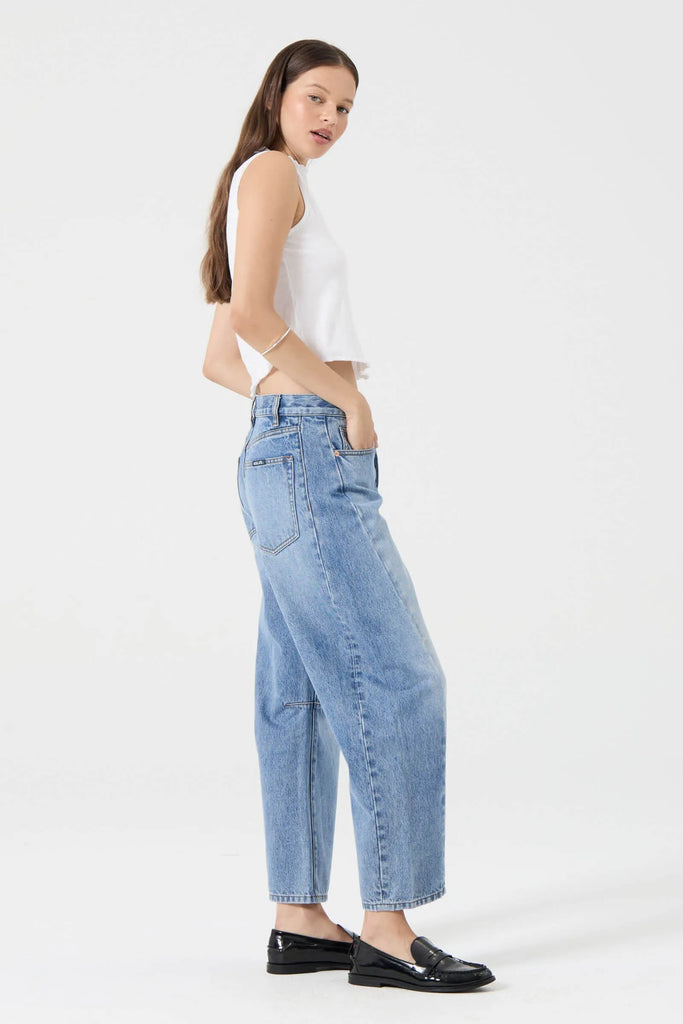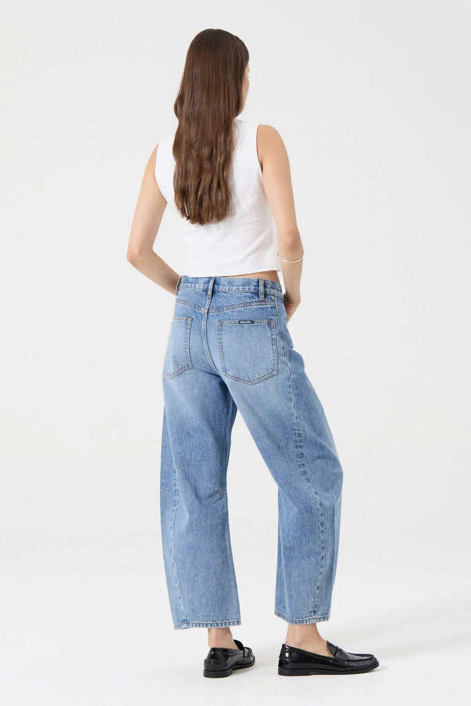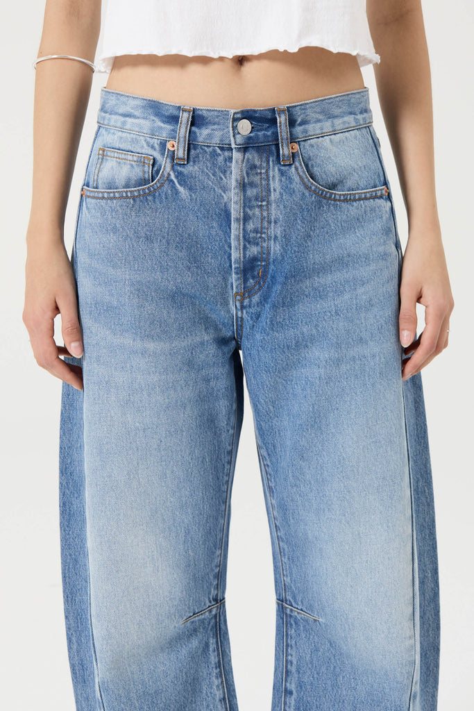 - It is a mid rise relaxed fit jean with a barrel leg silhouette