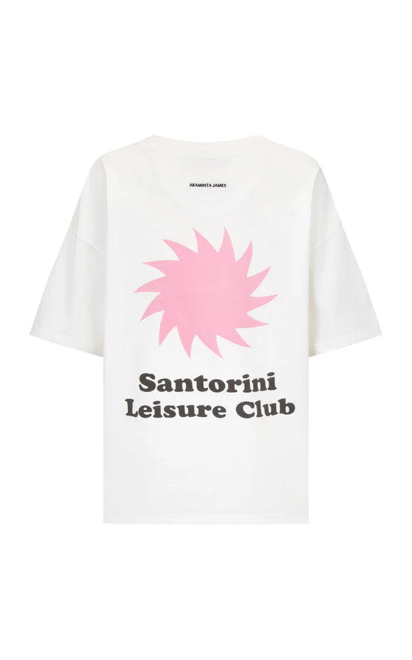 Araminta JamesAdd a little sunshine to your style with the Santorini Oversized Tee in Warm White. Made from 100% luxurious soft cotton, and featuring a round neckline and printed graphic on the back.