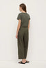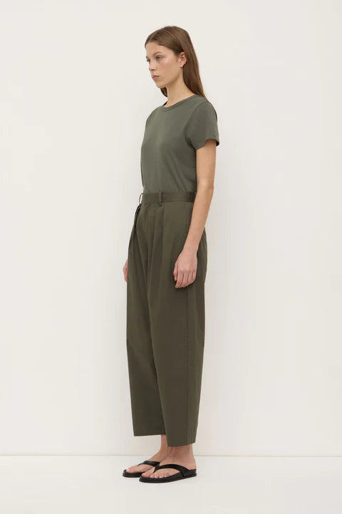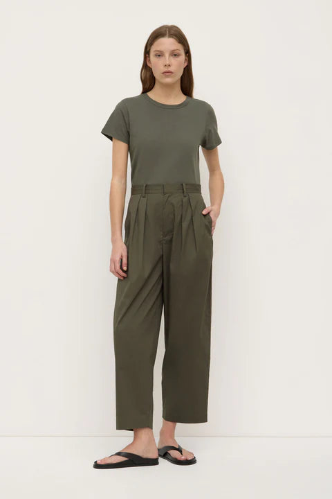 AssemblyThe Geno Poplin Pant in moss is a 100% cotton pleat-front pant with a cropped 3/4 length, relaxed yet tailored fit, and an internal drawcord.