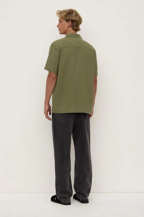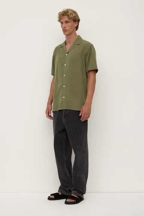 AssemblyThe Miller Short Sleeve Shirt in chive is a relaxed button-up made from a premium lyocell-linen blend with a smooth, soft feel and breathable finish.