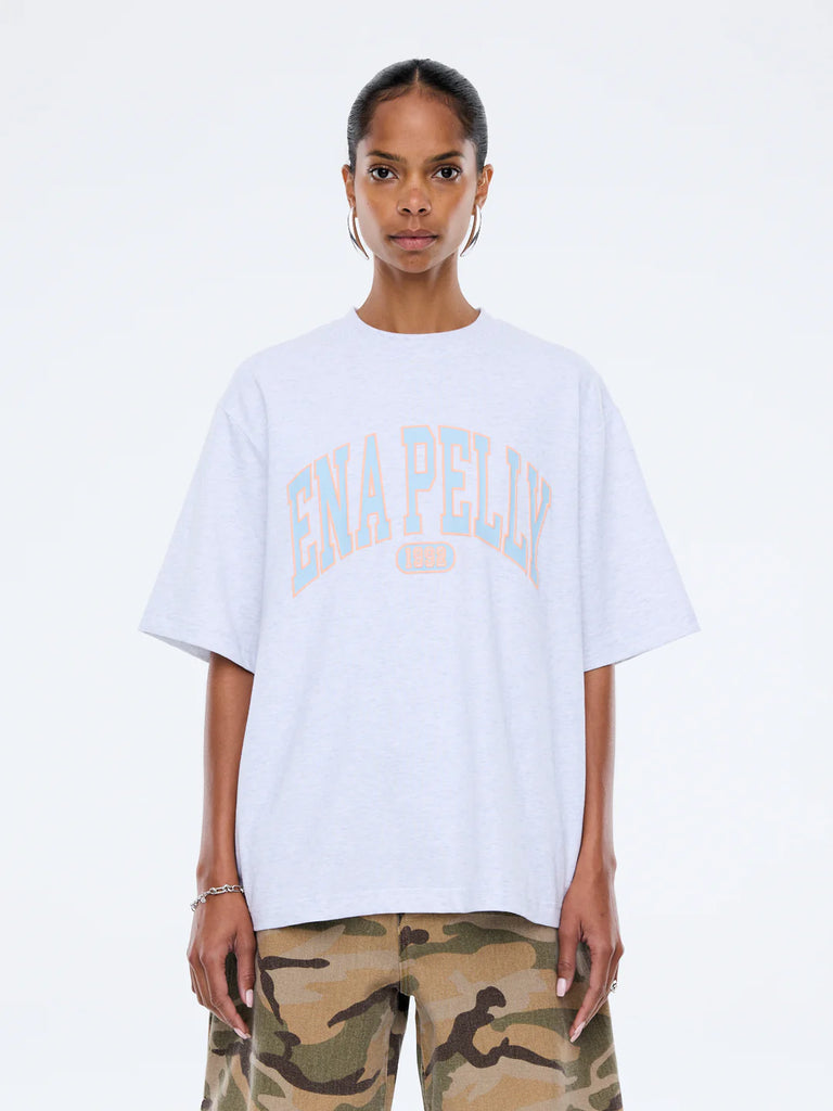 Ena PellyStreet Energy. Everyday Ease. The Blue Collegiate Tee is crafted from cotton in white marle with a relaxed, boxy fit. Finished with a collegiate Ena Pelly puff-print graphic for a modern, textured finish.
