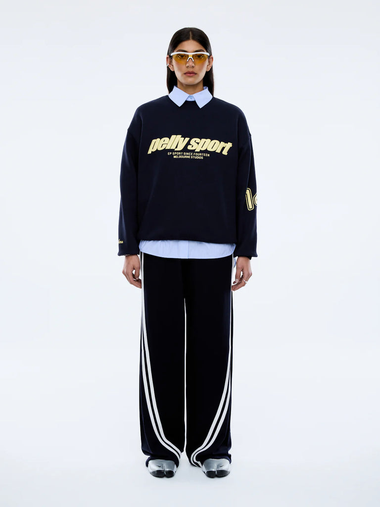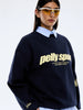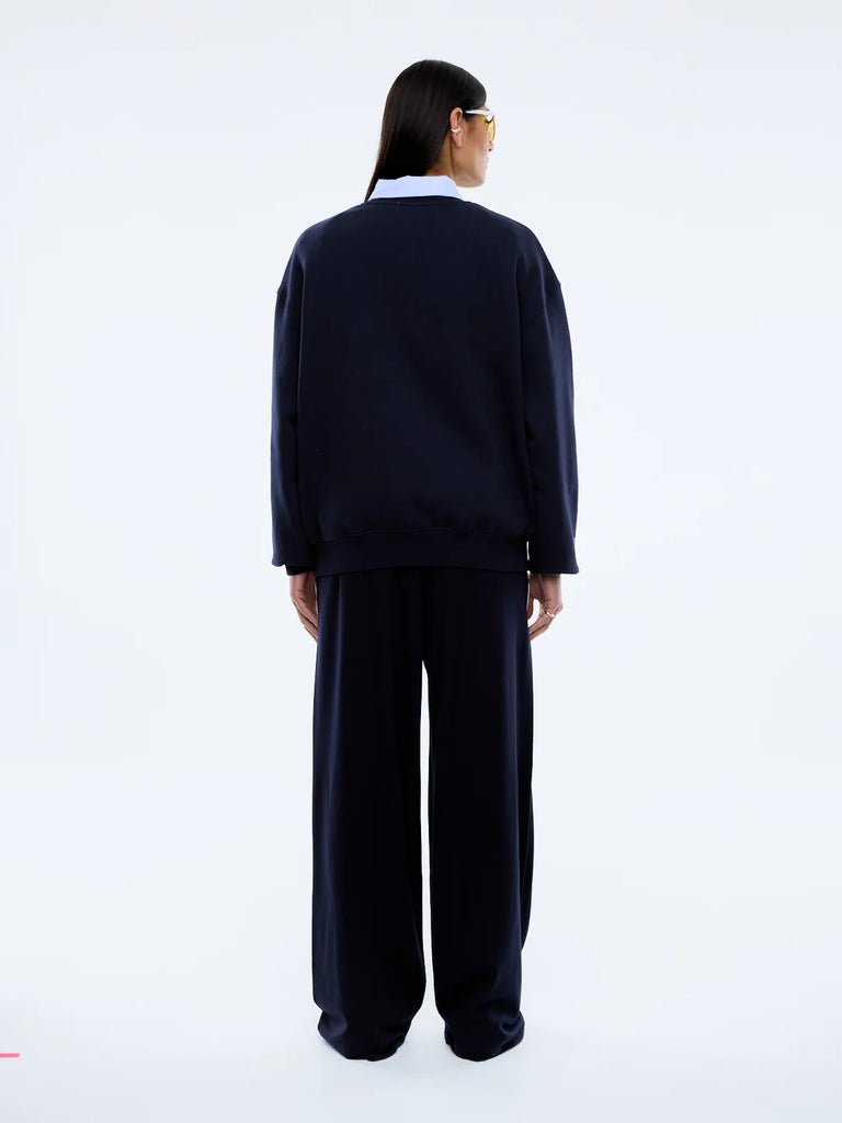 The Ena Sports Sweater in navy cotton blend fleece offers a soft oversized cut with drop shoulders. Puff and plastisol prints bring texture and attitude to this everyday staple.