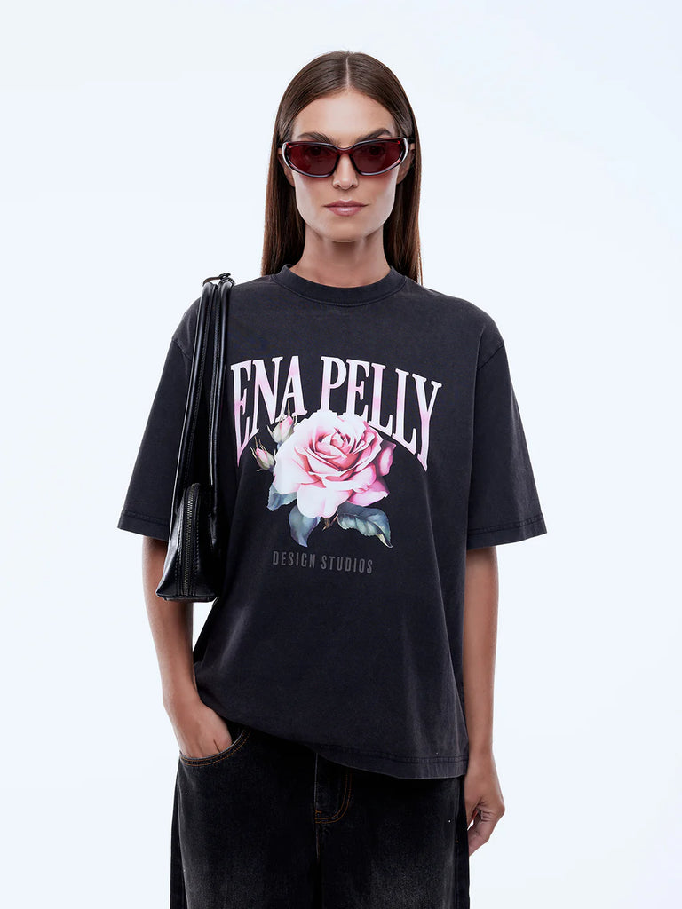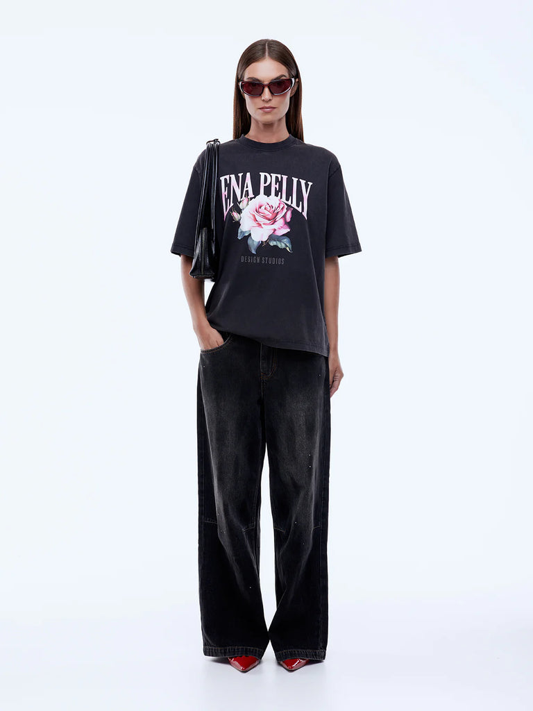 The Ena Pelly Rose Tee is made from soft cotton jersey with a boxy, relaxed shape and drop shoulders in vintage black. Finished with a feminine floral graphic and vintage wash, it delivers lived-in ease with expressive attitude.